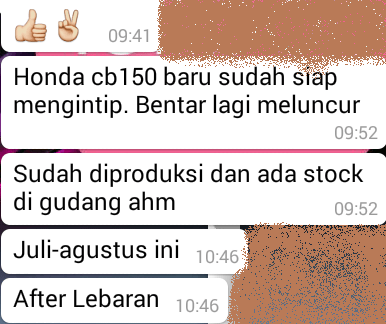 Burung Malam sedikit memberikan gambaran : ” Honda CB150 R Facelift ini lebih keren daripada gen sebelumnya, lebih berotot dan kaki-kaki sudah mengaplikasikan ban lebih besar dari ukuran sebelumnya. Sebetulnya aku (burung malam.red) sudah lihat langsung unitnya, namun karena etika perusahaan tidak boleh memotret barang yang masih belum dilempar kepasaran. So tidak bisa memberikan info lebih dalam, namun over All sangat keren jika di bandingkan dengan gen sebelumnya”